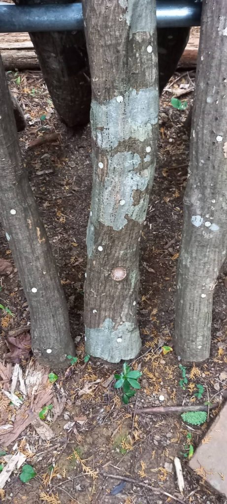 椎茸の菌植えしたほだ木です。一年後にはこのように立派な椎茸になります。 -